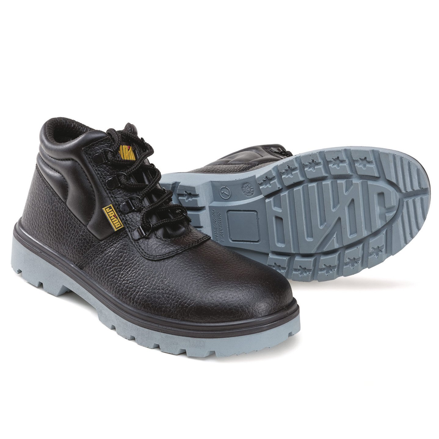 The Chicago safety shoe (Article No. JS-054) is crafted with a premium buffalo Barton print black genuine leather upper and designed to meet DIN-S3 safety standards. Built on last 522, it offers a comfortable and secure fit for EU sizes 38–46 (UK 4–12). The EN-standard 200-joule steel toe cap provides reliable impact protection, while the double-density PU sole ensures oil and fuel resistance, slip resistance, anti-static performance, and heat resistance up to 120°C. This makes Chicago a strong and dependable choice for demanding industrial environments.