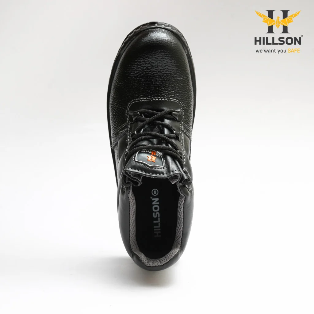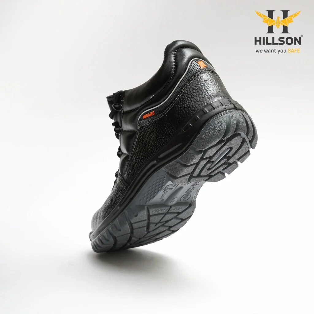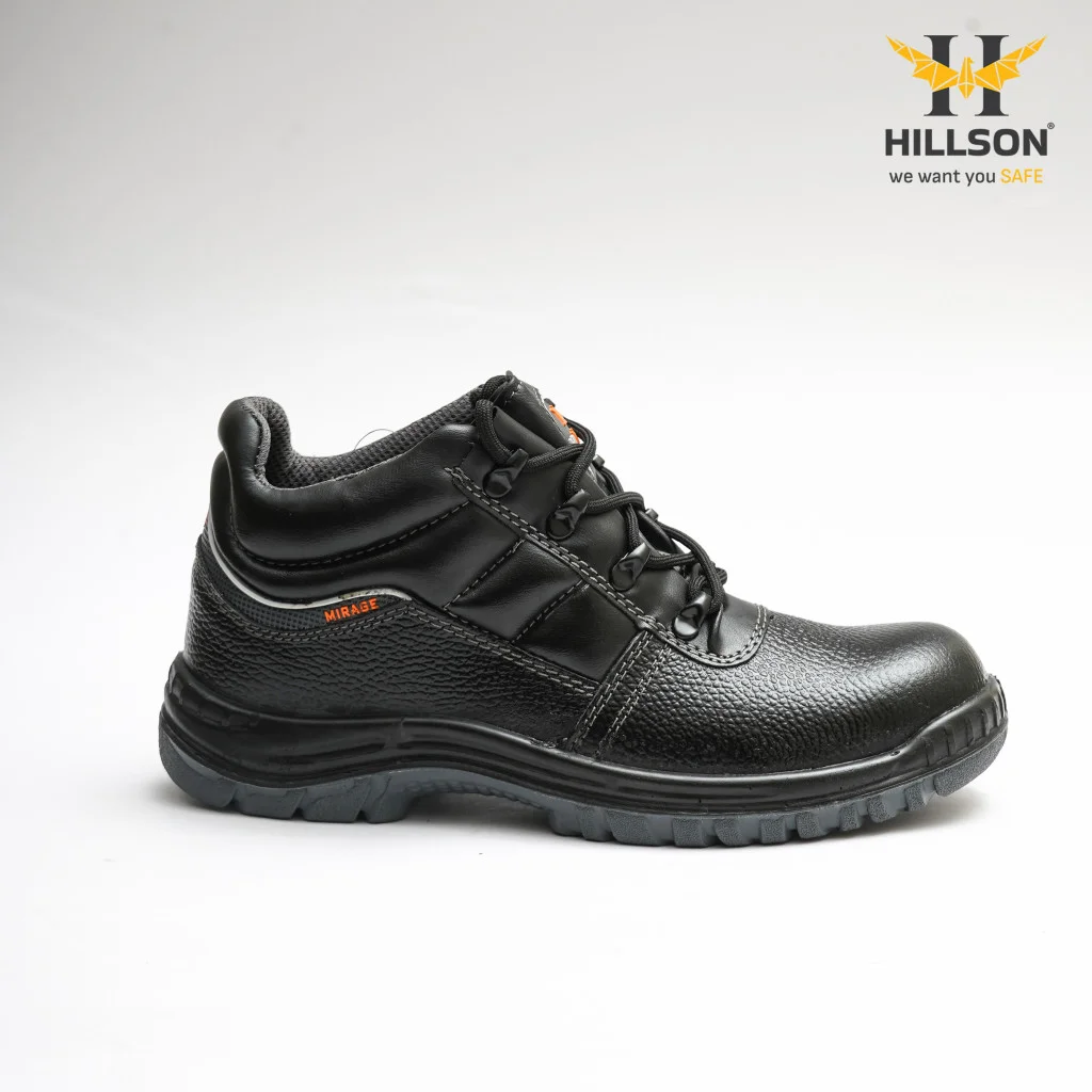 Hillson Mirage is a mid–high ankle safety shoe designed with a dual-density sole that delivers enhanced protection, stability, and a premium appearance. It features Ortho Bounce insocks with anti-fatigue properties to ensure long-lasting comfort during extended work hours. The EN-standard steel toe cap provides effective protection against falling objects. Crafted from 100% real leather in a Shelltac print, the upper adds durability and style, while the antistatic sole improves workplace safety. This shoe is ideal for construction, metal, and automobile industry applications.