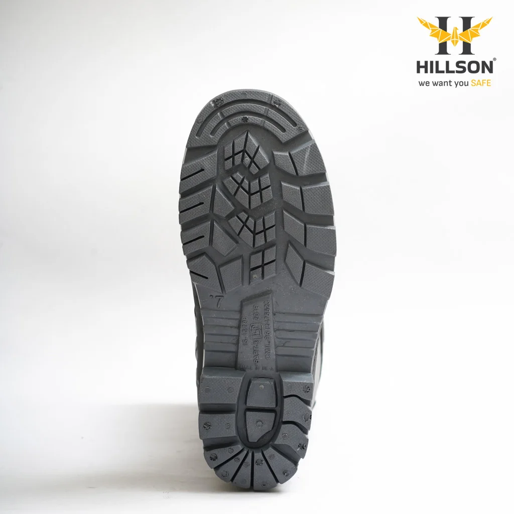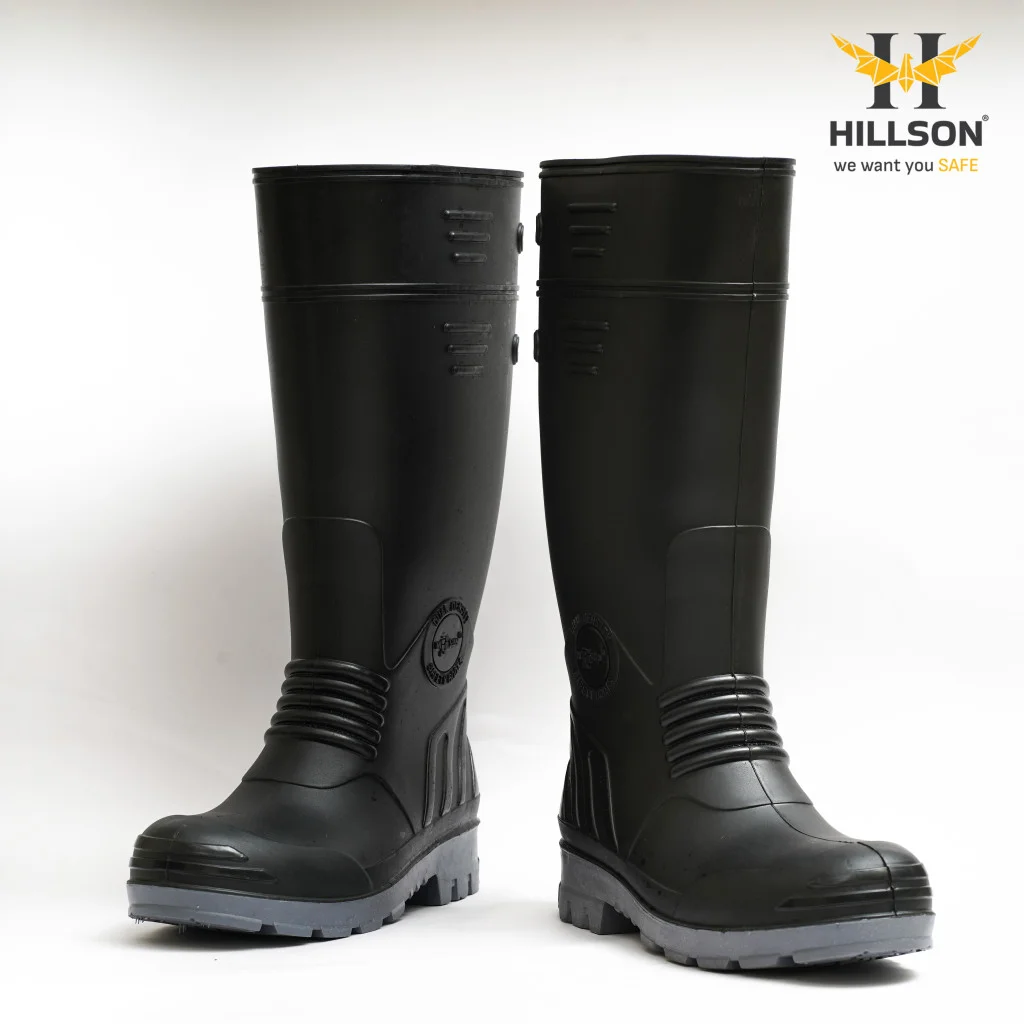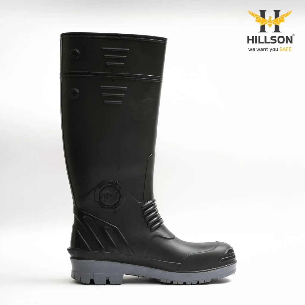 Hillson Torpedo-212 is a 15-inch ISI-marked safety gumboot manufactured from fully molded hard PVC for superior grip and durability. The outsole offers excellent anti-slip, anti-abrasion, anti-penetration, and heat resistance, along with protection against mild acids, alkalies, and oils. The upper is made from soft, flexible rubberized PVC for comfortable movement and features defect-free knitted fabric. Leak-resistant and compliant with all BIS standards, this gumboot is ideal for engineering, construction, petrochemical, cement, coal mining, and railway applications.