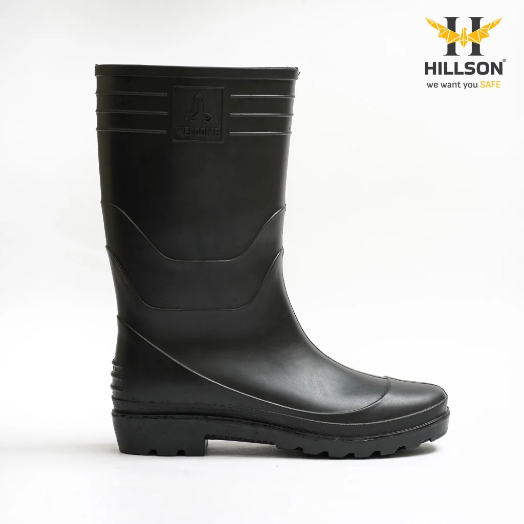 Hillson Welcome Black Gumboots are manufactured from dual-density polyvinyl chloride, offering calf-length coverage for enhanced protection. Featuring a 100% polyester lining, these gumboots are well suited for use in rainy, muddy, and humid conditions, ensuring comfort and durability throughout the day.