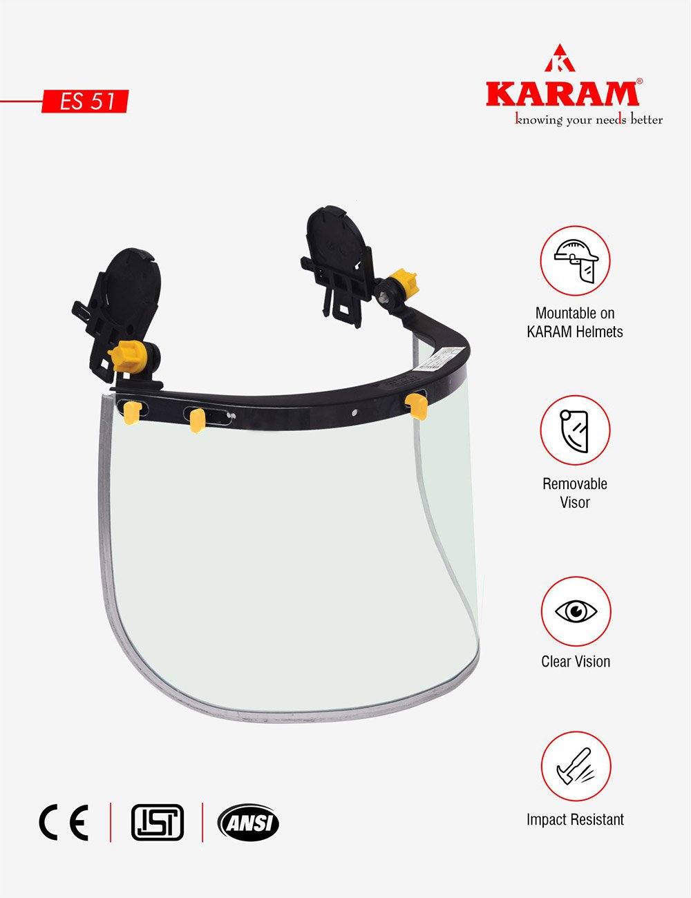 The ES 51 Face Shield is designed to provide effective face and eye protection against flying particles and debris from the front and sides, making it suitable for industrial, construction, and workshop environments. It ensures a wide field of coverage while maintaining clear visibility during operation.